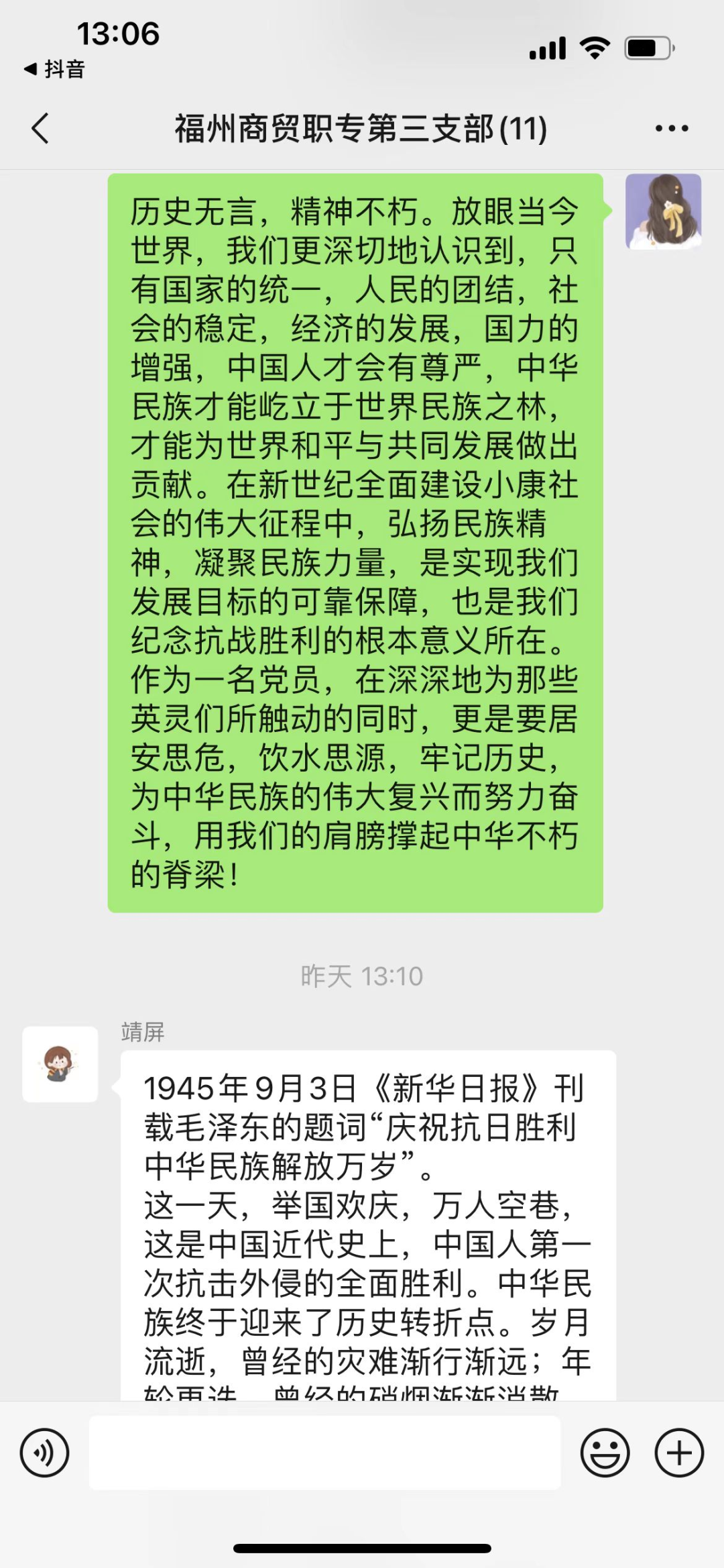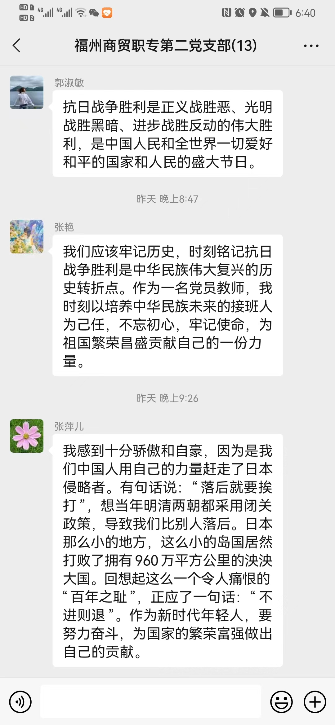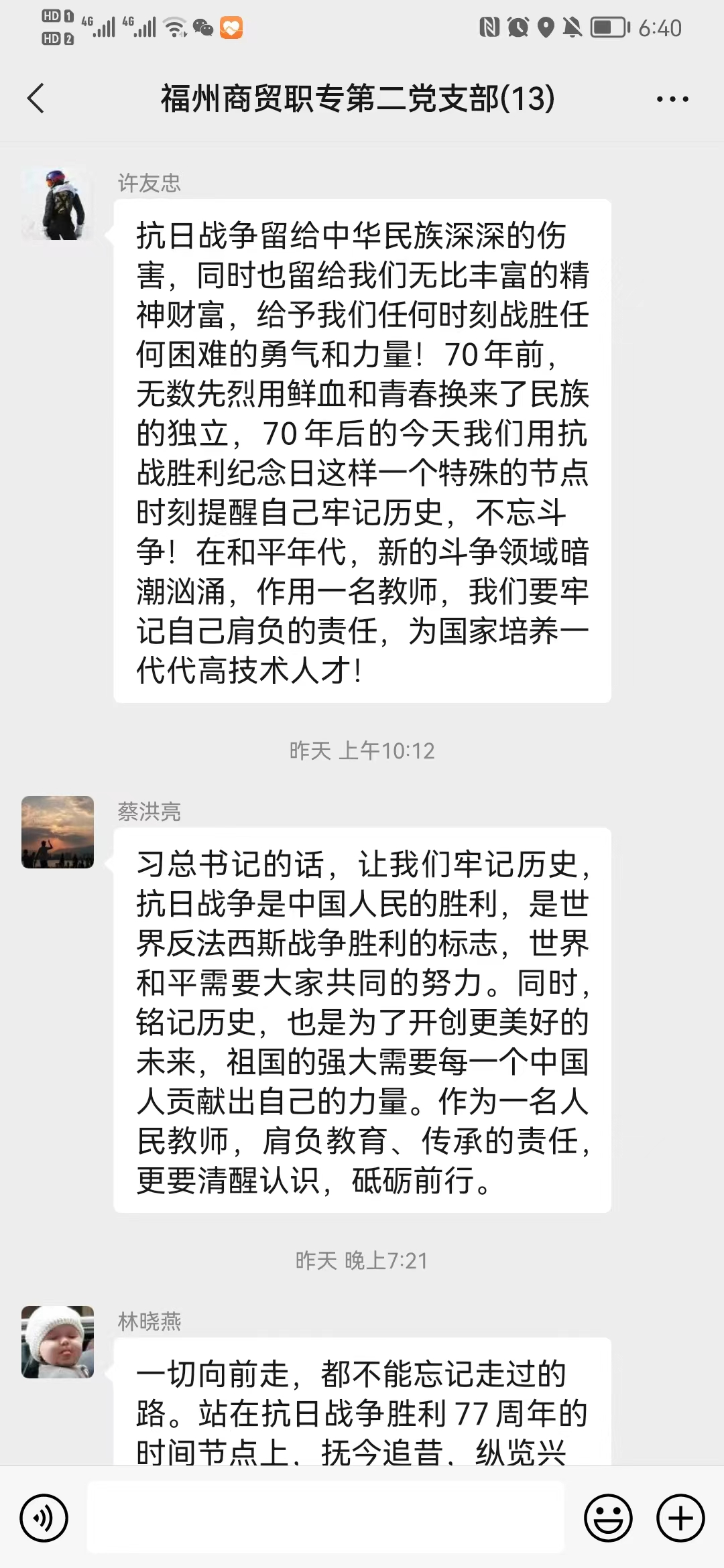 在學(xué)習(xí)研討中,我校黨員干部、教師共同回顧歷史場(chǎng)景,眾多愛國(guó)將士浴血奮戰(zhàn)、慷慨赴死;各界民眾萬(wàn)眾一心,同仇敵愾。無(wú)數(shù)志士不顧生死,為保衛(wèi)山河拋頭顱、灑熱血;數(shù)十萬(wàn)戰(zhàn)士前仆后繼,用他們的錚錚鐵骨保衛(wèi)家園,為戰(zhàn)爭(zhēng)勝利作出了重大貢獻(xiàn),為鑄就偉大的抗戰(zhàn)精神奠定了殷實(shí)基礎(chǔ)。偉大的抗戰(zhàn)精神,永遠(yuǎn)是激勵(lì)中國(guó)人民克服一切艱難險(xiǎn)阻,為實(shí)現(xiàn)中華民族偉大復(fù)興而奮斗的強(qiáng)大精神動(dòng)力。