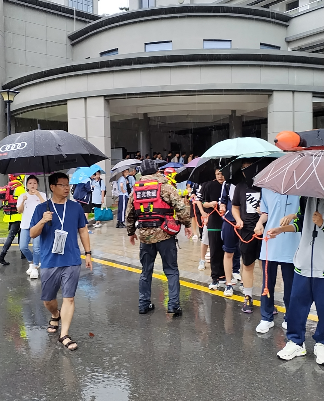第二天大雨不停,汛情升級,學(xué)校近千名學(xué)生被困。校領(lǐng)導(dǎo)班子一早召開緊急視頻會議,黨總支崔勇書記強(qiáng)調(diào)“安全第一,學(xué)生第一”理念,部署搶險工作。蔣舒凡校長帶著干部們冒雨出發(fā),克服重重阻礙到達(dá)學(xué)校。學(xué)生早餐問題剛解決,又面臨積水過深,運(yùn)輸中斷,午餐將斷供的難題。山體泥石有再度嚴(yán)重滑坡的可能。福州市教育局獲知學(xué)校險情,聯(lián)系星光救援隊。城門鎮(zhèn)領(lǐng)導(dǎo)和浚邊村干部也親臨學(xué)校,共同研判雨勢和險情,抽調(diào)龍吸水和救災(zāi)物資,協(xié)助學(xué)校救助圍困學(xué)生。下午四點(diǎn)左右,近千名學(xué)生終于順利轉(zhuǎn)移。