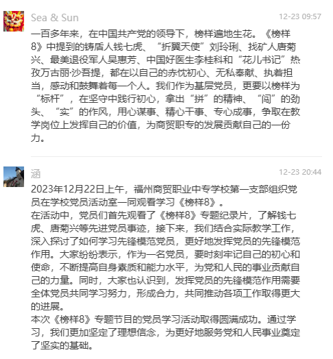 為深入學(xué)習(xí)貫徹習(xí)近平新時(shí)代中國特色社會主義思想,持續(xù)推動主題教育走深走實(shí),教育引導(dǎo)基層黨組織和廣大黨員干部學(xué)習(xí)榜樣、爭當(dāng)先進(jìn),主動作為、擔(dān)當(dāng)有為,2023年12月21日在中央電視臺綜合頻道播出了中央組織部、中央學(xué)習(xí)貫徹習(xí)近平新時(shí)代中國特色社會主義思想主題教育領(lǐng)導(dǎo)小組辦公室、中央廣播電視總臺聯(lián)合制作的《榜樣8》專題節(jié)目。12月22日上午,福州商貿(mào)職業(yè)中專學(xué)校第一支部組織支部黨員集中觀看學(xué)習(xí)。