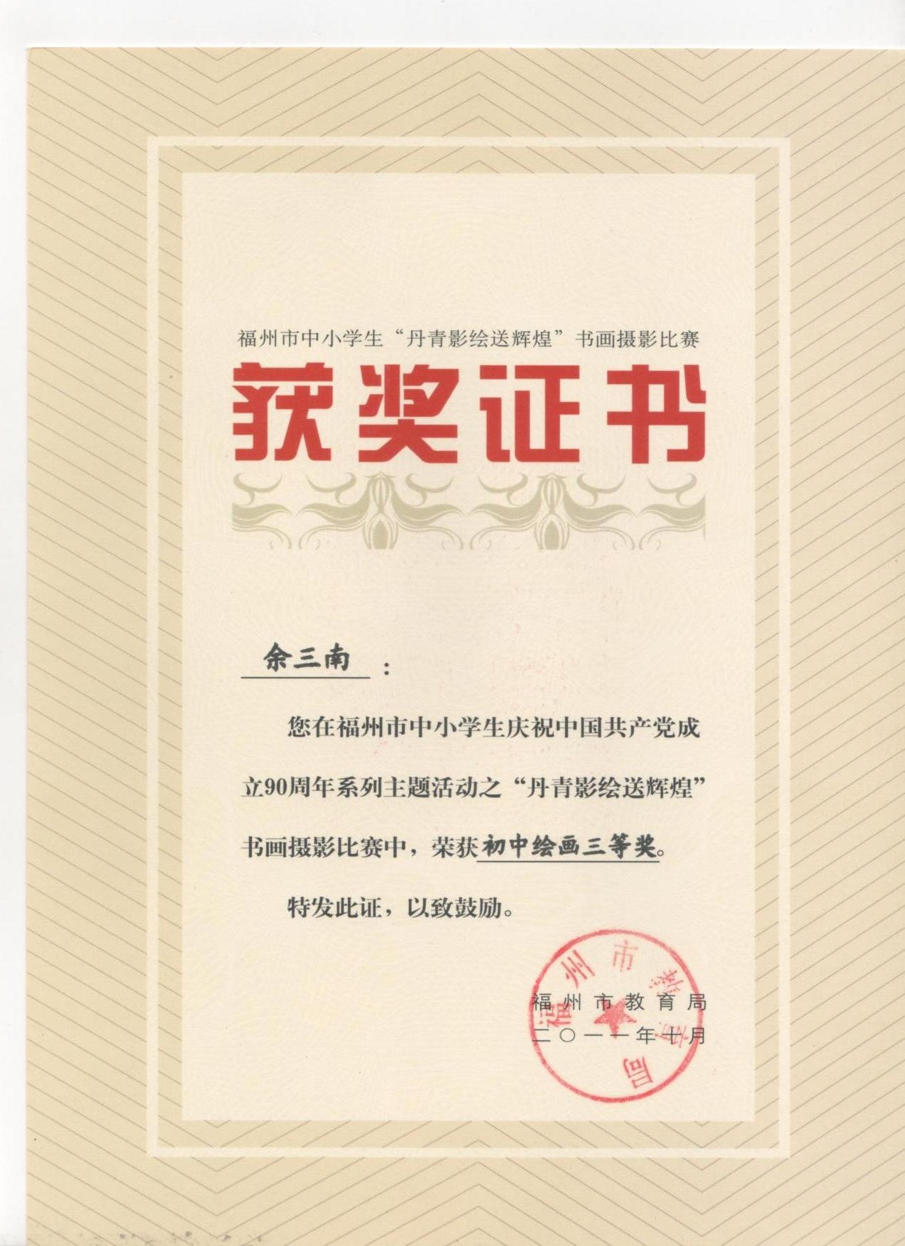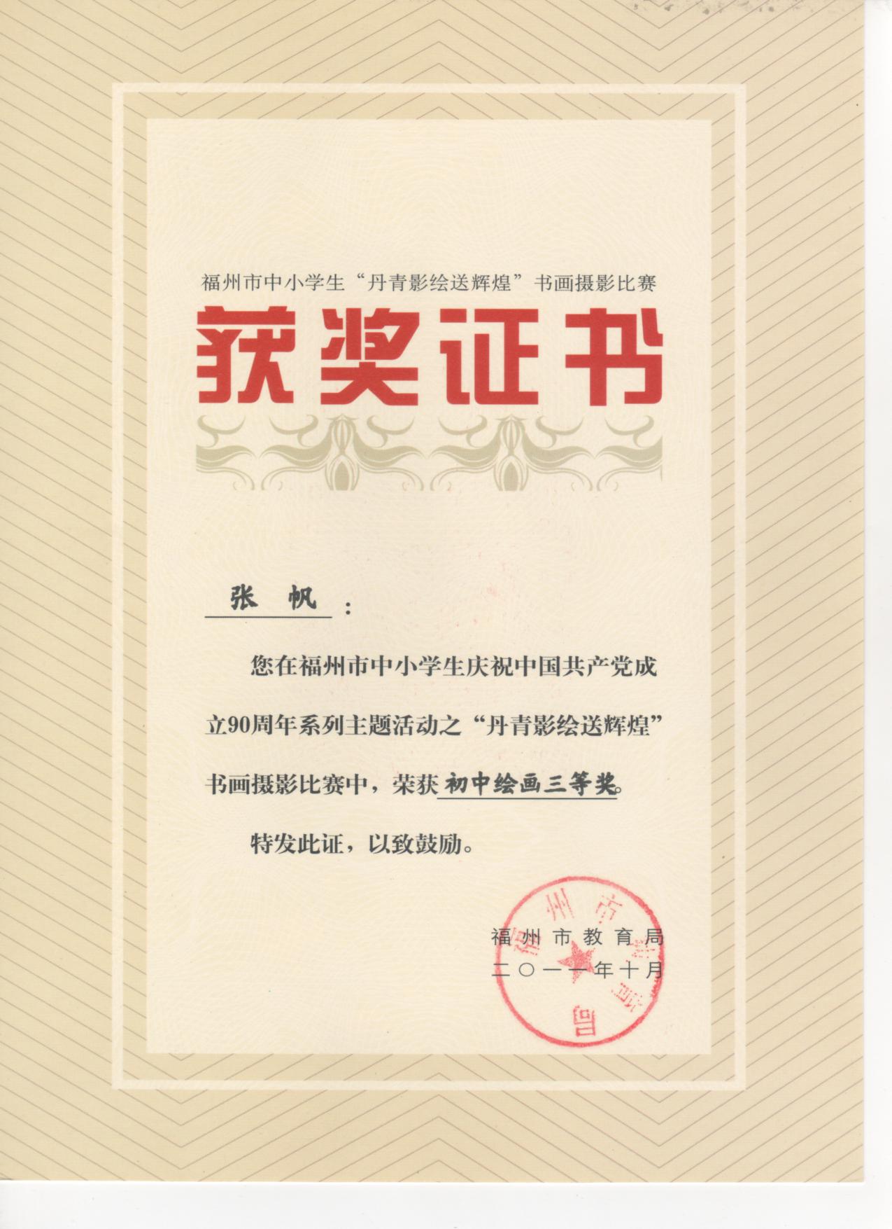 | 喜報(bào) 我校初中部學(xué)生參加福州市中小學(xué)生慶祝中國(guó)共產(chǎn)黨成立90周年系列主題活動(dòng)之“丹青影繪宋輝煌”書畫攝影比賽中獲得優(yōu)秀成績(jī)。 張帆 三等獎(jiǎng) 余三南 三等獎(jiǎng) 洪夢(mèng)婷 三等獎(jiǎng)  |