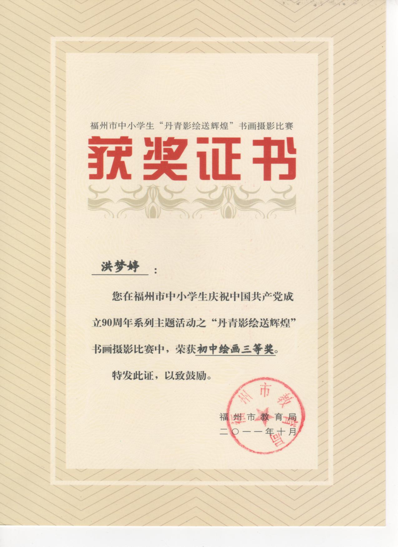 我校初中部學(xué)生參加福州市中小學(xué)生慶祝中國(guó)共產(chǎn)黨成立90周年系列主題活動(dòng)之“丹青影繪宋輝煌”書畫攝影比賽中獲得優(yōu)秀成績(jī)。