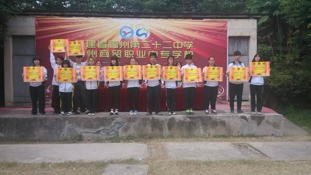 | 10月24日上午,福州商貿(mào)職專(福州二十二中)第二十二屆體育節(jié)暨四十三屆校運(yùn)動(dòng)會(huì)閉幕式在操場(chǎng)舉行。 黃舒榮副校長(zhǎng)致閉幕詞,他向所有辛勤工作的教練員、裁判員和工作人員表示衷心的感謝!向競(jìng)賽的優(yōu)勝班級(jí)和取得優(yōu)異成績(jī)的運(yùn)動(dòng)員表示熱烈的祝賀!并對(duì)全體同學(xué)在比賽中表現(xiàn)的勇于拼搏、吃苦耐勞、團(tuán)結(jié)和諧的精神予以表?yè)P(yáng),并希望全體師生積極開展豐富多彩的體育活動(dòng)。 接著,崔勇副校長(zhǎng)公布了運(yùn)動(dòng)會(huì)比賽成績(jī)?cè)u(píng)比結(jié)果,校領(lǐng)導(dǎo)層和各處室主任向獲獎(jiǎng)的班級(jí)頒發(fā)了獎(jiǎng)狀。 2014體育節(jié)“友愛之星”名單 初一1:林星宇、劉夢(mèng)雨、馮舒怡、姚予婷 初一2:張林、楊高嵩 初一3:余振楷、徐爽、愈凡、姚思杰、李中一 初二1:謝家杰、康喬、鄭英華、毛小明 初二2:康峰、楊夢(mèng)麗 初二3:林世城、高家耀、原瑩、張佳沁 初三1:蘭文強(qiáng)、鄧榕發(fā)、吳仁盛、李鈺欣 初三2:林雨欣、王昕鈺、張嬌宜、洪燕 初三3:林逸紅、李文芳、阮文婷、林金玉 14(1):梁嘉欣、周雨晨 14(2):董靜思、江莉、林錦姮、蔡錦花、李龍 14(3):陳鳳、陳君麗、 14(4):劉成煌、朱麗榕 14(5):柯心婷、江鑫、陳嘉琦 14(6):陳秀水 13(1):曹岑琳、鄭文星、陳旭東、陳宙 13(2):李友彬、林青霞、何信超 13(3):陳詩(shī)瑤、吳捷、林子希 13(4):林錦紅、劉巍 13(5):鐘曉青 江陳靜 江小芳 13(6):張鍵均、謝其鴻 13(7):黃進(jìn)魁 12升學(xué)(1):唐下瑩、杜昌榕 12升學(xué)(2):盧婷、江城、林志鑫、吳鵑 2014體育節(jié)行為規(guī)范獎(jiǎng) 初二2、初二3、13(5)、13(2)、14(3)、14(5)、12升學(xué)(1) 2014體育節(jié)組織獎(jiǎng) 初一1、13(6)、13(7)、14(2)、14(6)、12升學(xué)(2)  |