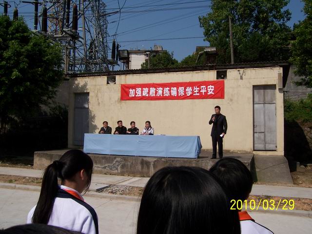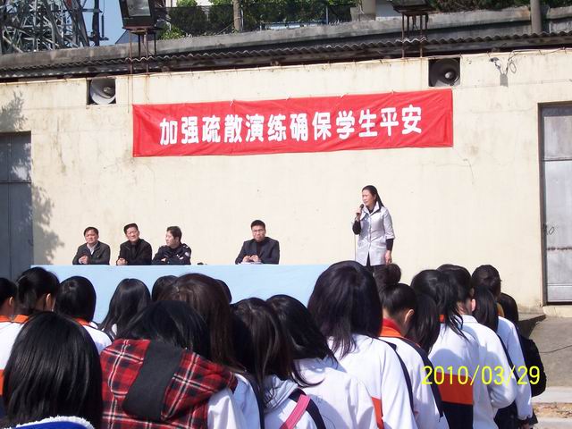| 福州商貿(mào)職業(yè)中專學(xué)校(福州市第22中學(xué))于2010年3月29日上午升旗儀式中,開展“加強(qiáng)疏散演練,確保學(xué)生平安”的國旗下講話活動。在活動中學(xué)校特別邀請片警陳秀強(qiáng)給同學(xué)們做交通、治安等方面的安全法制報(bào)告。丘琰校長,崔勇副校長分別就安全疏散演練做了總結(jié),并強(qiáng)調(diào)安全疏散演練的重要性。這次活動在全校師生中掀起宣講安全知識、守安全法規(guī)、行安全路、做安全事的熱潮,為形成學(xué)生們的安全意識,具備防災(zāi)減災(zāi)的安全技能,養(yǎng)成安全習(xí)慣,創(chuàng)建平安和諧校園打好基礎(chǔ)。  |