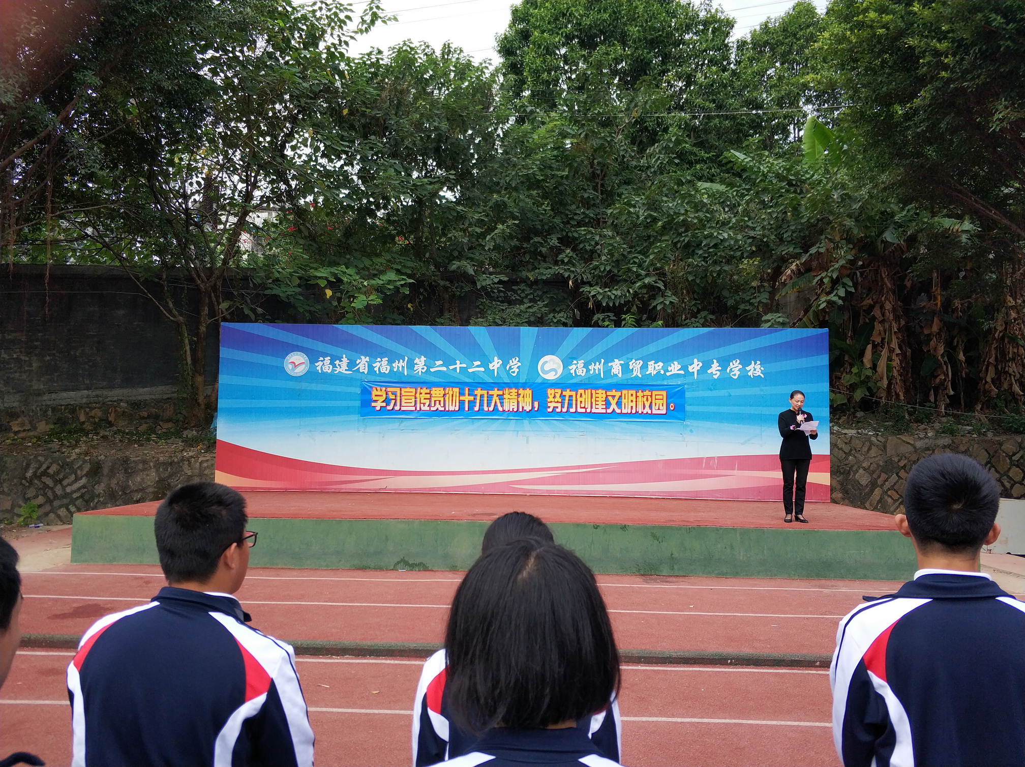 2017年11月6日,福州商貿(mào)職業(yè)中專(zhuān)學(xué)校(福州第二十二中學(xué))開(kāi)展了以“學(xué)習(xí)宣傳貫徹十九大精神,努力創(chuàng)建文明校園”為主題的國(guó)旗下講話(huà)。林紅書(shū)記發(fā)表了講話(huà)。