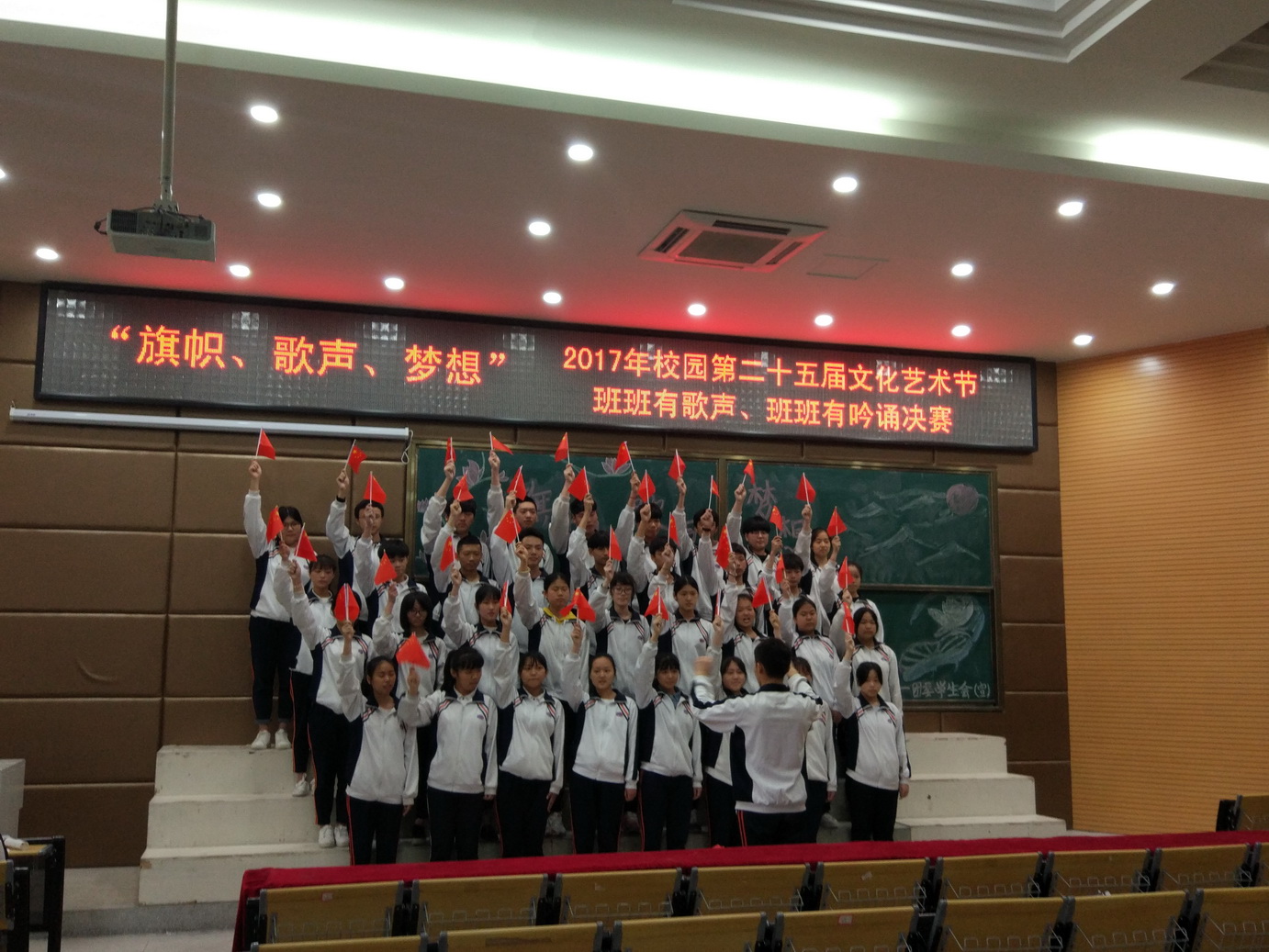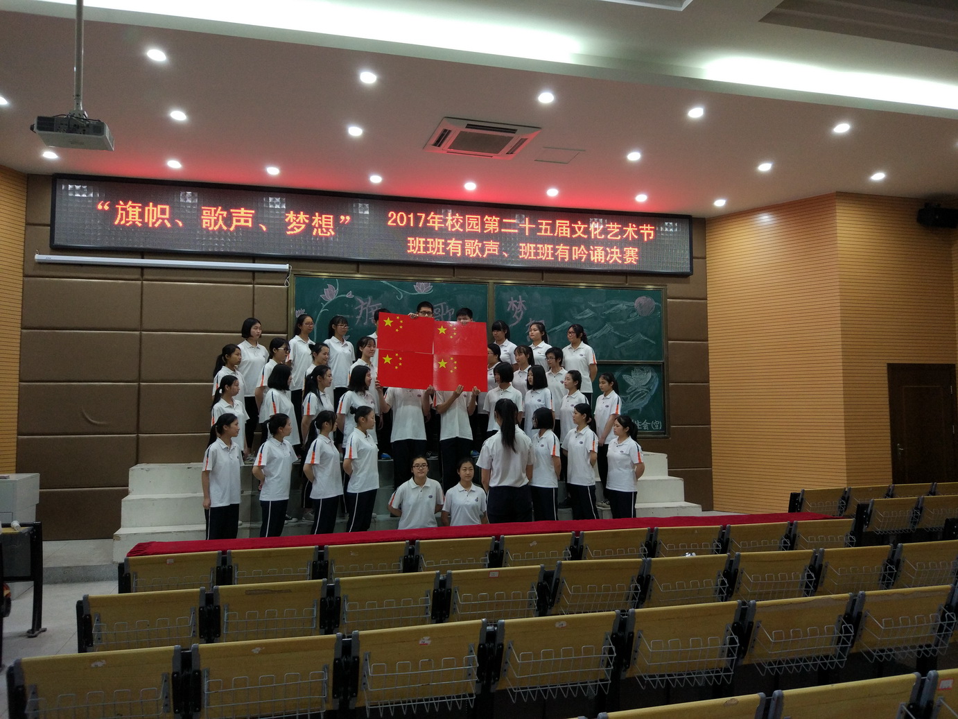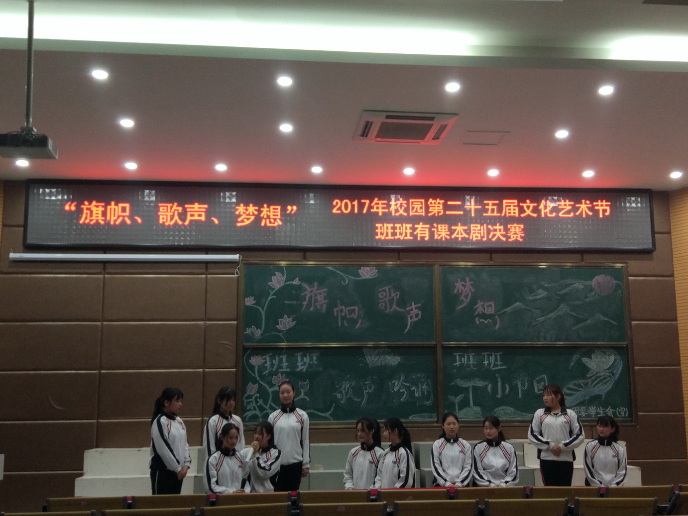 為進一步活躍校園文化,豐富學(xué)生的藝術(shù)生活,繼承革命光榮傳統(tǒng),弘揚民族精神,讓每個學(xué)生都能參與到藝術(shù)活動中,從而提高學(xué)生的藝術(shù)修養(yǎng)在校園內(nèi)唱響時代主旋律,營造健康向上的良好氛圍,通過歌聲傳唱優(yōu)秀歌曲,陶冶學(xué)生情操,2017年4月28日的早上8:30我們在思源樓階梯教室舉辦了一場以“旗幟 歌聲 夢想”為主題的校園班班有歌聲、班班有吟誦、班班有小節(jié)目、班班有課本劇比賽。在本次比賽勝出的班級將會在5月份的藝術(shù)節(jié)進行匯演。各班學(xué)生精心選歌,對比賽充滿了熱情,同時班干部積極帶頭,組織班級的同學(xué)進行練習(xí)。各班班主任也利用課余時間加緊對學(xué)生的訓(xùn)練,指導(dǎo)學(xué)生們練唱。