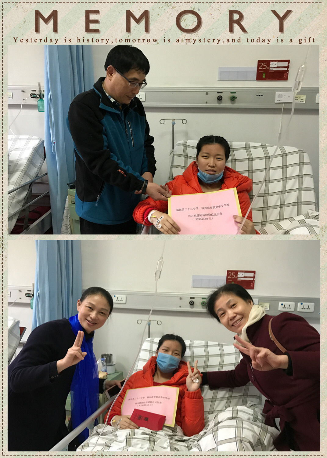 2017年3月21日,福州商貿(mào)職業(yè)中專學校、福州第二十二中學教師代表、家委會代表、校友會代表在方張龍校長、林紅書記的帶領下前往協(xié)和醫(yī)院慰問陳宇同學。方張龍校長詢問了陳宇的病情以及醫(yī)療方案,轉達了全校師生的問候與關心。林紅書記在慰問中反復叮囑“有困難要及時提出”。陳宇同學說:“我既是不幸的,也是幸運的。我會將前面的擋路石變成登高的墊腳石,我會努力的!”