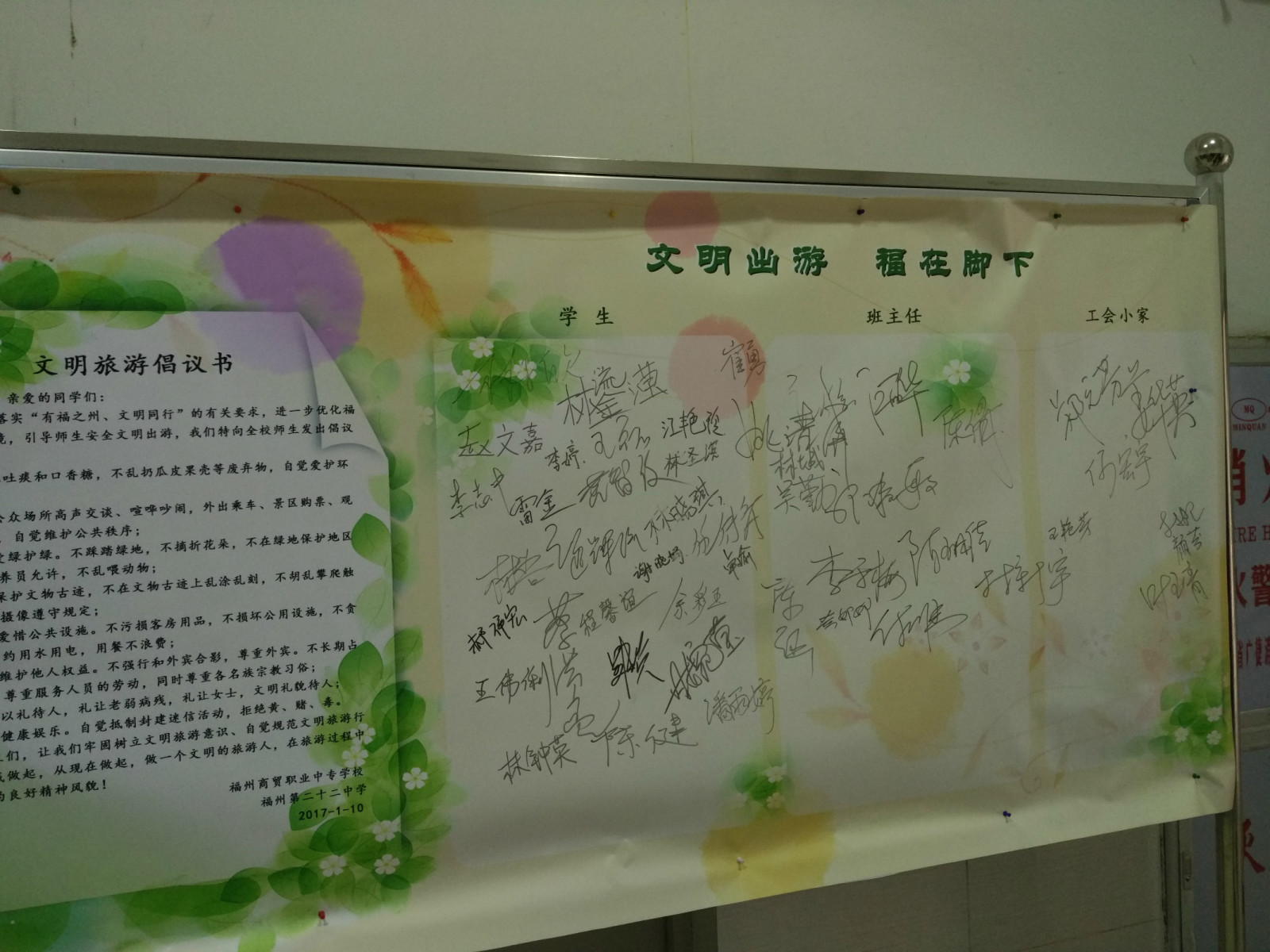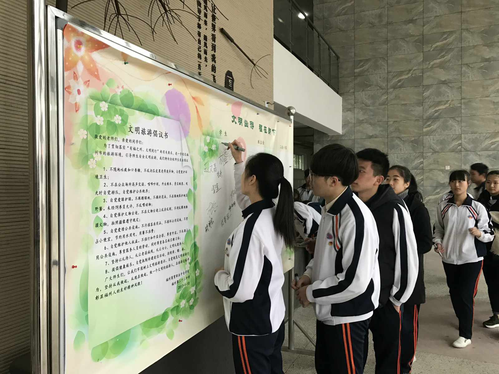 緊接著學(xué)生會(huì)的陳婧雯同學(xué)宣讀“文明旅游倡議書”,廣大師生代表還參加了簽名儀式。