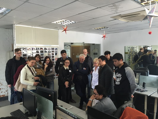 2016-3-14,我校師生陪同德國(guó)漢諾威多媒體職業(yè)中學(xué)走進(jìn)鼎石文化。鼎石文化多媒體制作公司是集攝影現(xiàn)場(chǎng)、錄音、后期制作為一體的公司,是我校畢業(yè)生林松獨(dú)資創(chuàng)辦的。該公司擬定今年與我校合作辦學(xué),在2016級(jí)新生中招收多媒體制作專業(yè)的學(xué)生,這些學(xué)生職二時(shí)的實(shí)訓(xùn)場(chǎng)所就是在鼎石文化,真正做到在學(xué)中做、在做中學(xué)。