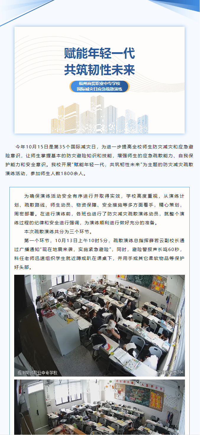 “賦能年輕一代,共筑韌性未來”——福州商貿(mào)職業(yè)中專學(xué)校國(guó)際減災(zāi)日應(yīng)急疏散演練