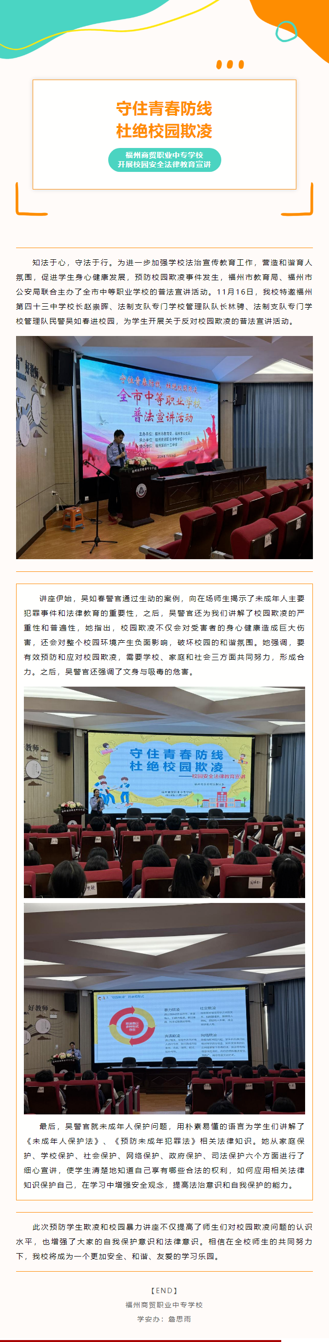 守住青春防線 杜絕校園欺凌——福州商貿(mào)職業(yè)中專學(xué)校開展校園安全法律教育宣講