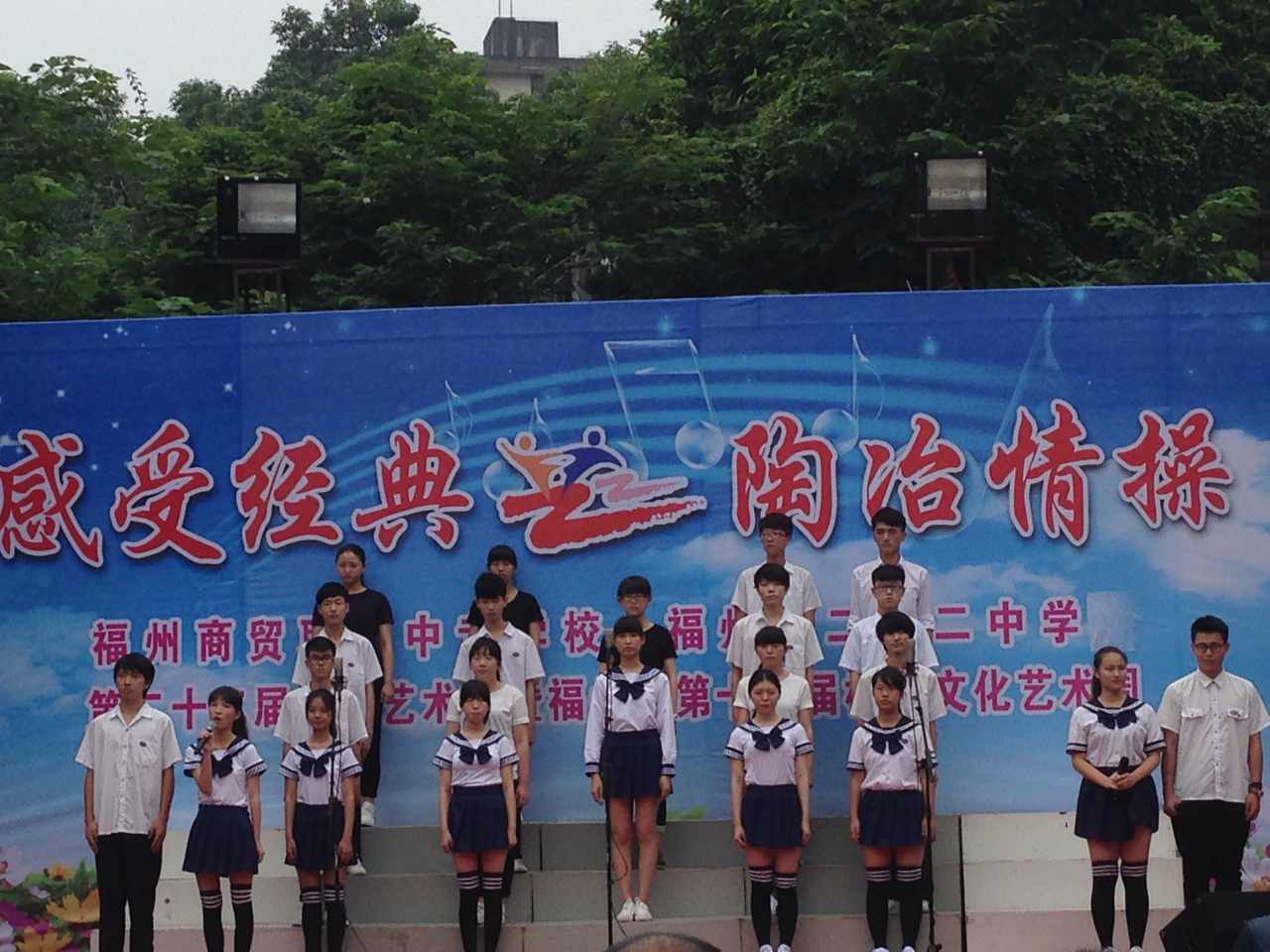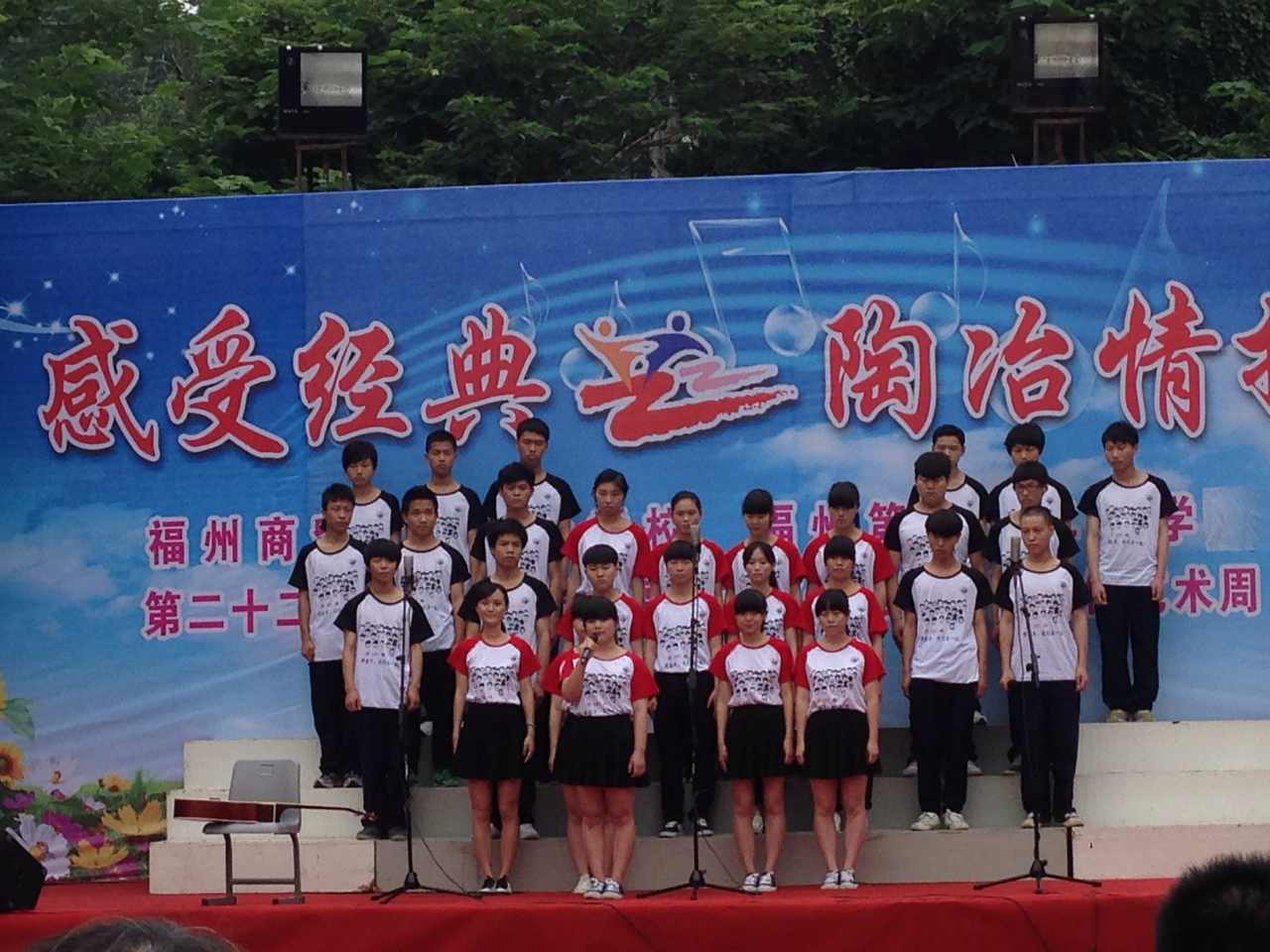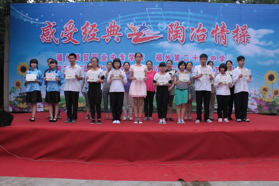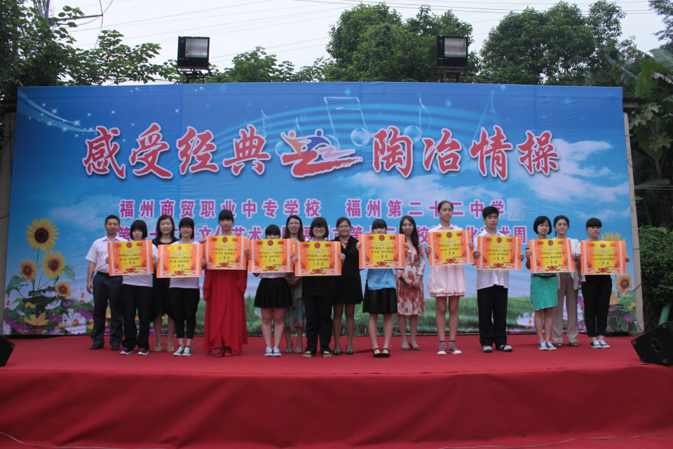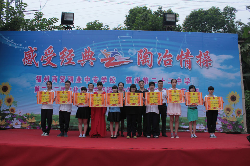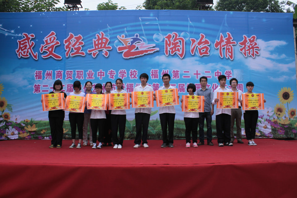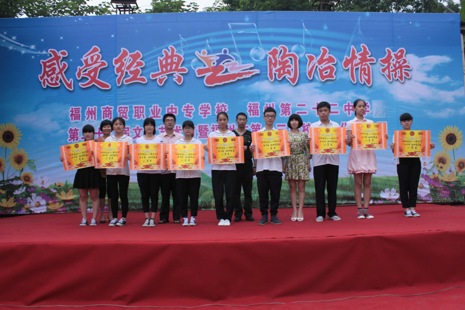 | 2014年5月,福州商貿(mào)職業(yè)中專學(xué)校(福州第二十二中學(xué))又迎來(lái)新一屆的校園文化藝術(shù)節(jié),這次第二十二屆藝術(shù)節(jié)的主題是 “感受經(jīng)典 陶冶情操”。 5月30日上午, “班班有歌聲”“班班有吟誦”評(píng)比和小節(jié)目匯演在校操場(chǎng)舉行。同學(xué)們精心準(zhǔn)備,雖然天氣陰沉沉,但大家都熱情高漲,力求展示出最好的一面。同時(shí),“班班有美展”評(píng)比也在進(jìn)行中。整個(gè)活動(dòng)緊張而有序地進(jìn)行,最終獲得圓滿成功!最后舉行了藝術(shù)節(jié)各項(xiàng)評(píng)比獲獎(jiǎng)的頒獎(jiǎng)儀式。 福州商貿(mào)職業(yè)中專學(xué)校 福州第二十二中學(xué) 德育處 2014年5月30日  |