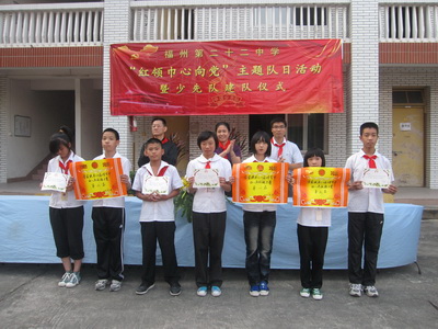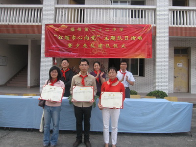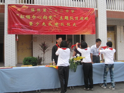 | 2011年10月17日下午16時(shí)許,在嘹亮的《中國(guó)少年先鋒隊(duì)隊(duì)歌》聲和鮮紅的隊(duì)旗映照下,福州二十二中學(xué)“紅領(lǐng)巾心向黨”暨在閩江學(xué)院校區(qū)舉行。校領(lǐng)導(dǎo)丘琰校長(zhǎng),商雄書記,崔勇副校長(zhǎng)出席了建隊(duì)活動(dòng),并分別為少先隊(duì)員們做了講話,鼓勵(lì)隊(duì)員們繼承和弘揚(yáng)少先隊(duì)的光榮傳統(tǒng),要愛祖國(guó),愛人民,愛勞動(dòng),愛科學(xué),努力學(xué)習(xí),鍛煉身體,培養(yǎng)能力,立志為建設(shè)有中國(guó)特色社會(huì)主義現(xiàn)代化國(guó)家貢獻(xiàn)力量,努力成長(zhǎng)為社會(huì)主義現(xiàn)代化建設(shè)的合格人才,做共產(chǎn)主義事業(yè)的接班人。 最后,活動(dòng)在“時(shí)刻準(zhǔn)備著,為共產(chǎn)主義事業(yè)而奮斗”的誓詞聲中結(jié)束。 福州二十二中學(xué) 德育處 2011年10月18日  |