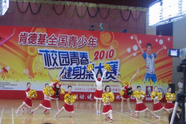 2010年6月26日上午,我校啦啦操隊員參加了2010肯德基全國青少年校園青春健身操大賽,她們身著紅裝在眾多啦啦操隊中顯得尤為醒目。隊員們伴著熱情如火的動感音樂,揮灑汗水激情舞動青春。最終,力逐群雄,以16.25分取得三等獎的優(yōu)異成績。參賽前,啦啦操隊員們每天刻苦努力訓練,她們不厭其煩地練習著舞蹈動作。團隊12個人一起訓練,共同收獲著一種難得的經(jīng)歷,就像家人一般。她們在過程中和指導老師不斷地發(fā)現(xiàn)問題,轉變思路不斷改進,以使舞蹈日趨完美。縱使日復一日的練習使他們腰酸背痛,她們絲毫沒有怨言仍努力堅持著。因為動作強度較大,許多女生的膝蓋和手肘都出現(xiàn)了不同程度的淤青現(xiàn)象。原本家中的嬌嬌女們在此時搖身一變成為了賽場上的“雨中蓓蕾”。隊員們的能力不僅體現(xiàn)在啦啦操方面,從服裝的設計到舞蹈的編排無不體現(xiàn)著隊員們的智慧結晶。