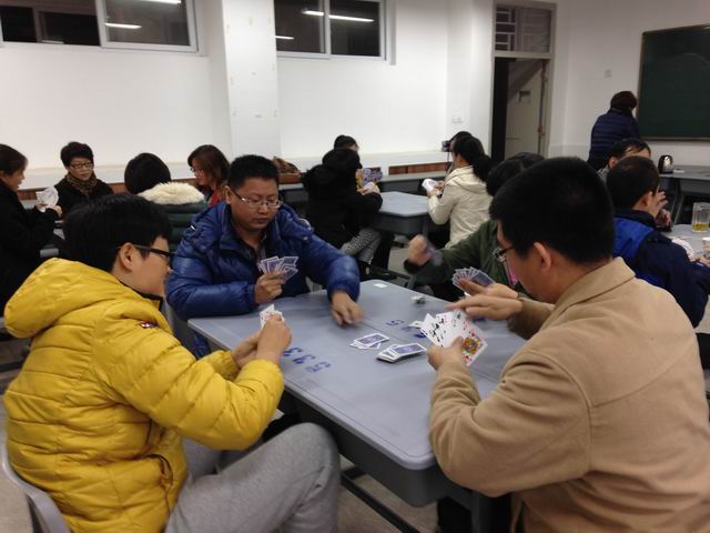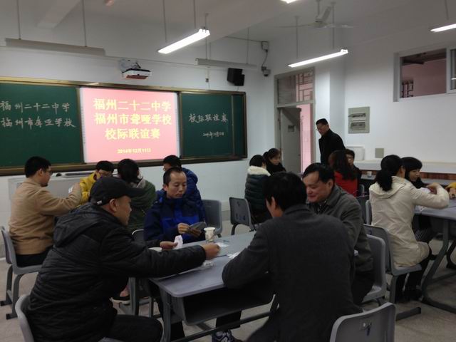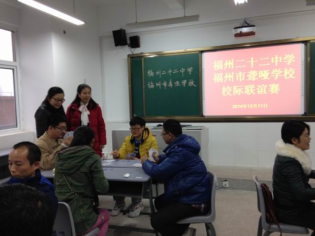 2014年12月11日,我校與福州聾啞學(xué)校分別派出15人開展校際聯(lián)誼賽。下午15:00-17:00進(jìn)行的是雙升和橋牌比賽,選手們神機(jī)妙算,斗智斗勇,各顯身手,比賽過程中有戰(zhàn)況激烈,交纏廝殺的;有遙遙領(lǐng)先輕松勝出的,有開展拉鋸戰(zhàn)最終握手言和的,有開局不利后來居上的,各小組參賽隊(duì)員在比賽中充分施展技術(shù),默契配合,力爭(zhēng)上游。比賽進(jìn)行得激烈而緊張,無論勝負(fù)結(jié)果如何大家均是喜笑顏開,觀戰(zhàn)的同志們也是樂不可支。
