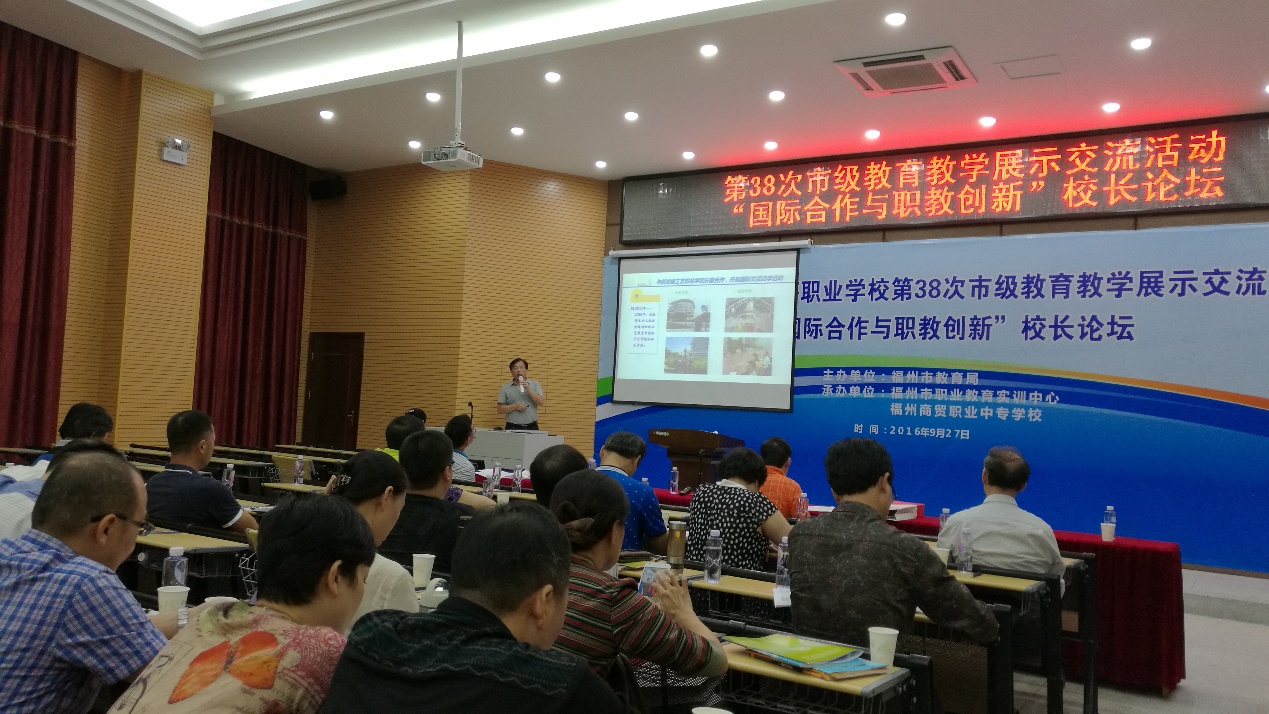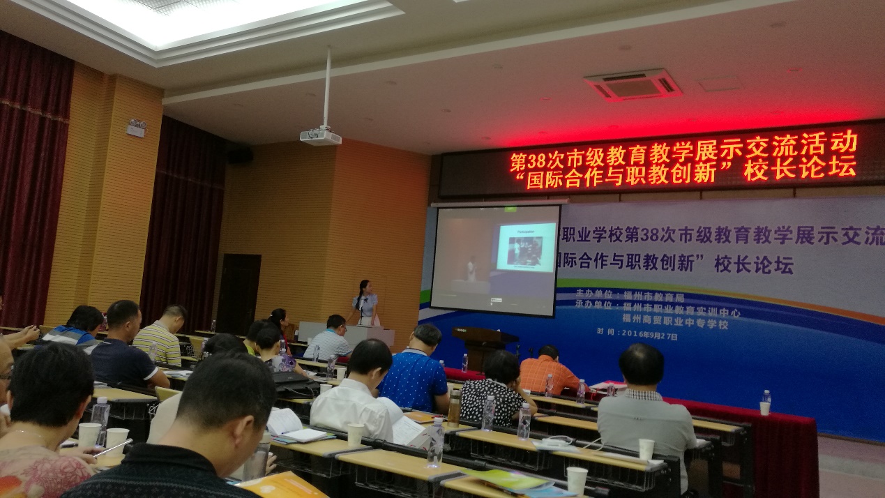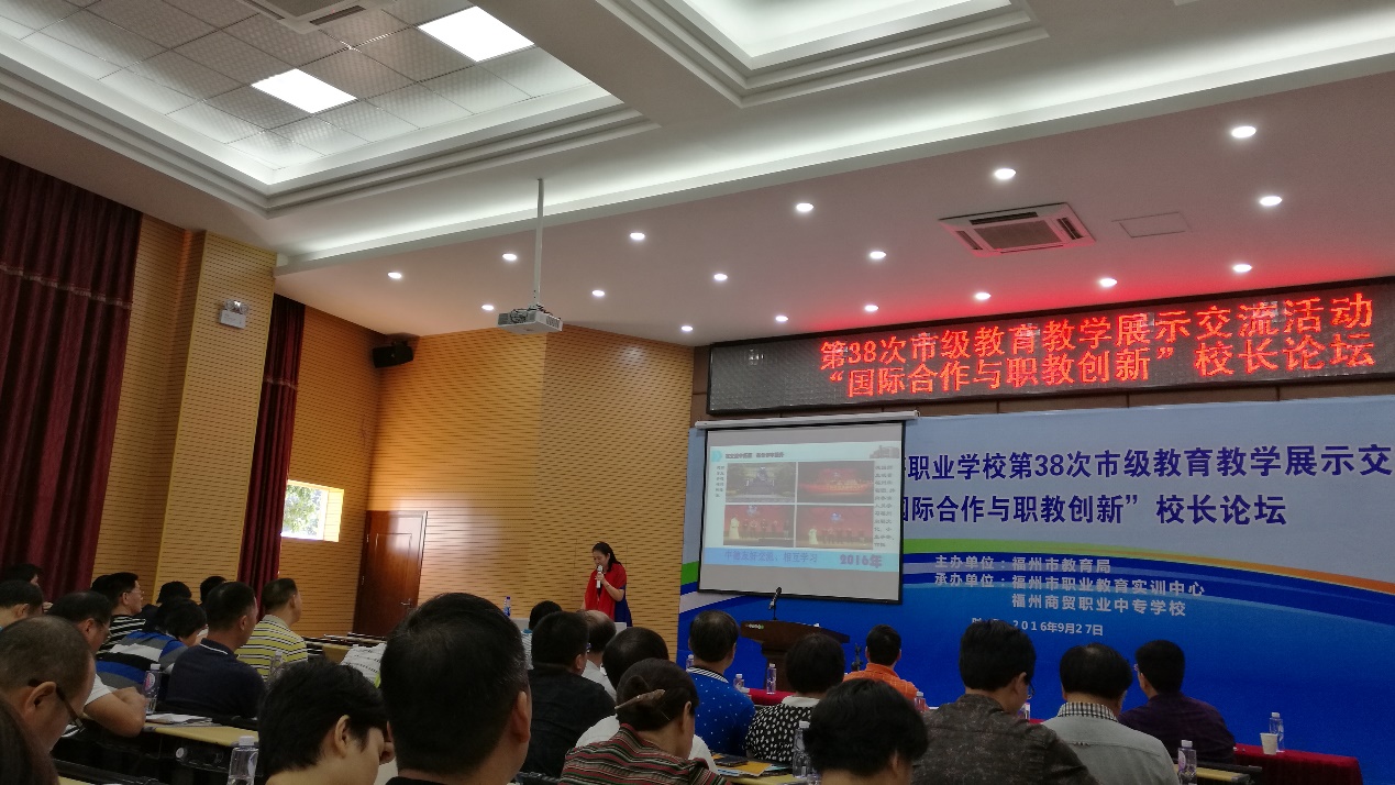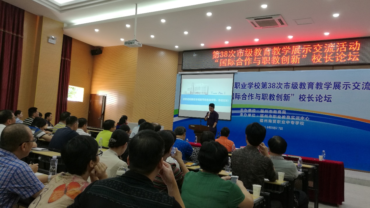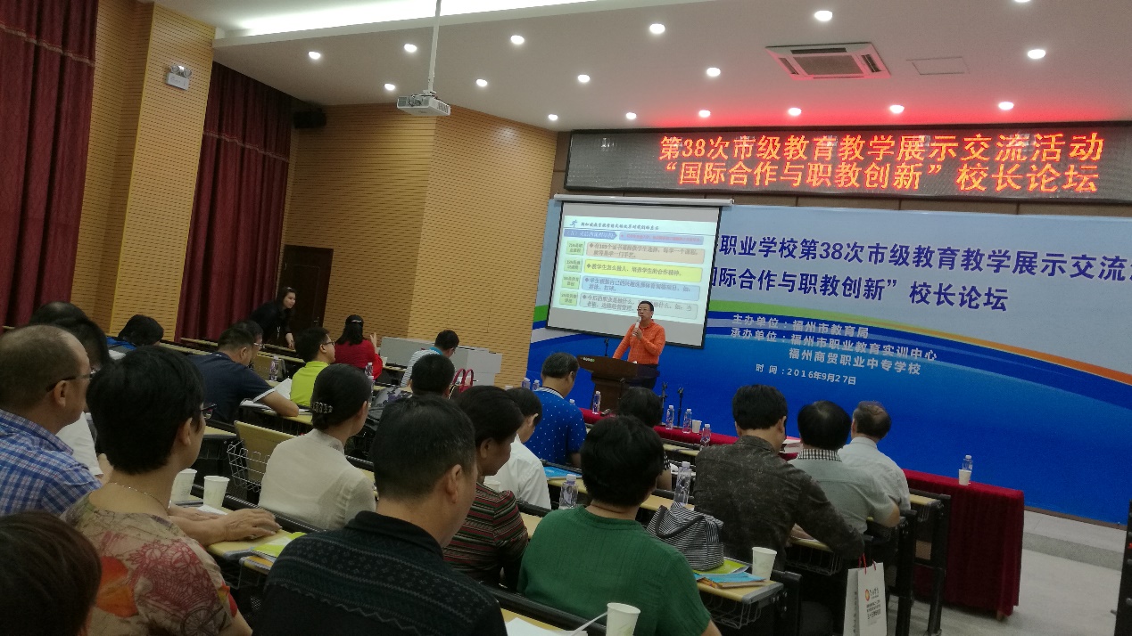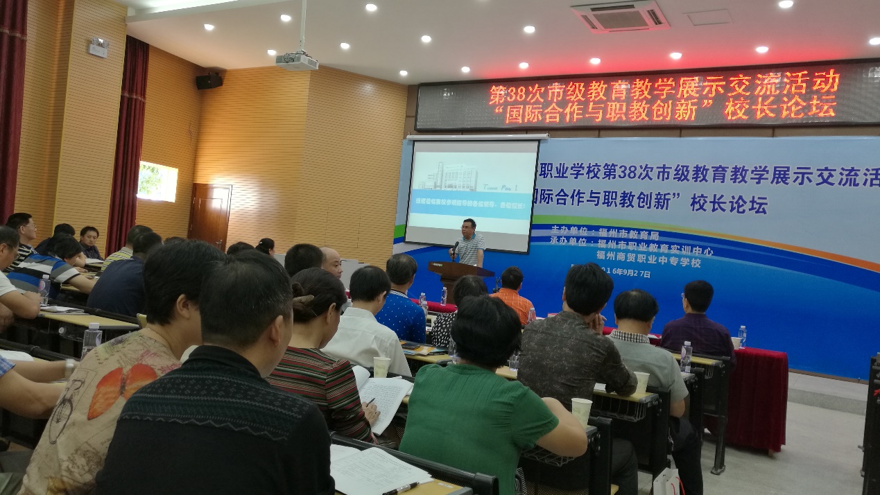 2016年10月25日,福州市中等職業(yè)學(xué)校第38次市級教育教學(xué)展示交流活動暨“國際合作與職教創(chuàng)新”校長論壇在福州商貿(mào)職業(yè)中專學(xué)校成功舉辦。此次活動由福州市教育局主辦,福州市職業(yè)教育實(shí)訓(xùn)中心和福州商貿(mào)職業(yè)中專學(xué)校共同承辦。