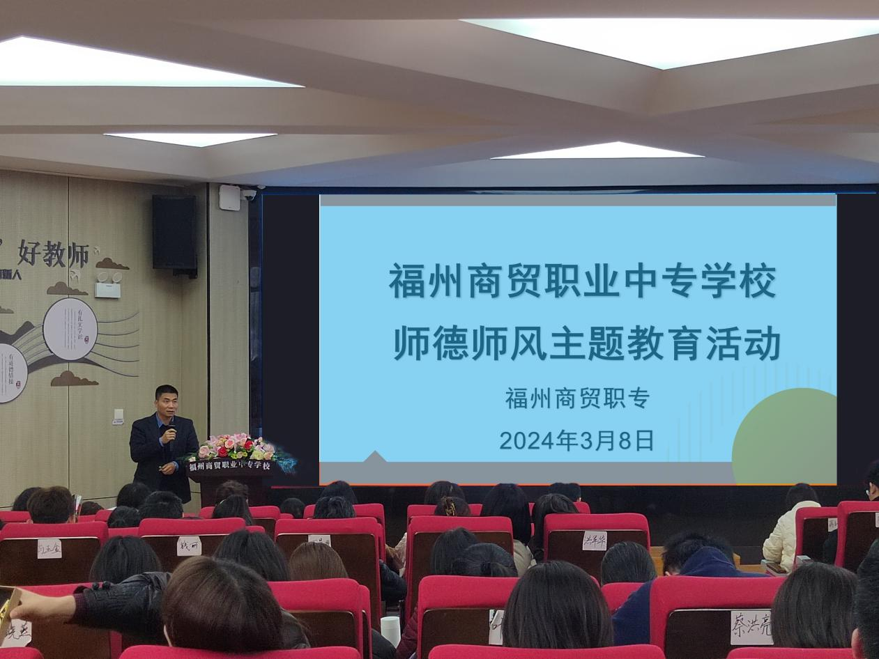 2024年3月8日下午,福州商貿(mào)職業(yè)中專學(xué)校在一樓報(bào)告廳開展師德師風(fēng)主題教育之張桂梅榜樣的力量,本次大會(huì)全體教師參加,崔勇書記做主題講話。