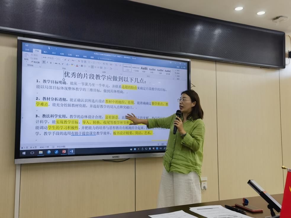 蔣舒凡校長則是圍繞“優(yōu)秀的片段教學(xué)應(yīng)做到什么”,從上課的儀態(tài)儀表入手,進(jìn)行了現(xiàn)場片段展示。講解內(nèi)容包括:教學(xué)目標(biāo)要明確,做到能以局部目標(biāo)體現(xiàn)整體教學(xué)的三維目標(biāo);教材分析要透徹,能正確認(rèn)識所選片段在教材中的地位、作用;教學(xué)重、難點(diǎn)要突出,要選好教學(xué)的切入點(diǎn)和突破口;教學(xué)方法要科學(xué)實(shí)用,教學(xué)的總體設(shè)計(jì)合理,富有新意,能表現(xiàn)自己獨(dú)立的見解等。蔣舒凡校長用生動的肢體動作和語言,讓在座的老師們身臨其境,對片斷教學(xué)有了更深的認(rèn)識。整場講座既有理論高度,又有實(shí)踐深度,參評老師們紛紛表示受益匪淺,對于提升我校教師隊(duì)伍業(yè)務(wù)能力起到了很強(qiáng)的推動作用。學(xué)之愈深,知之愈明,行之愈遠(yuǎn)。此次職稱評審業(yè)務(wù)考核專題講座是我校深入開展習(xí)近平新時代中國特色社會主義思想主題教育的充分體現(xiàn)。通過教師團(tuán)隊(duì)老帶新,師帶徒,不僅提升了職稱參評教師備戰(zhàn)業(yè)務(wù)考核的針對性和目標(biāo)性,促進(jìn)了年輕教師的成長,也將推動學(xué)校職稱評審工作向更加規(guī)范化、高質(zhì)量發(fā)展。