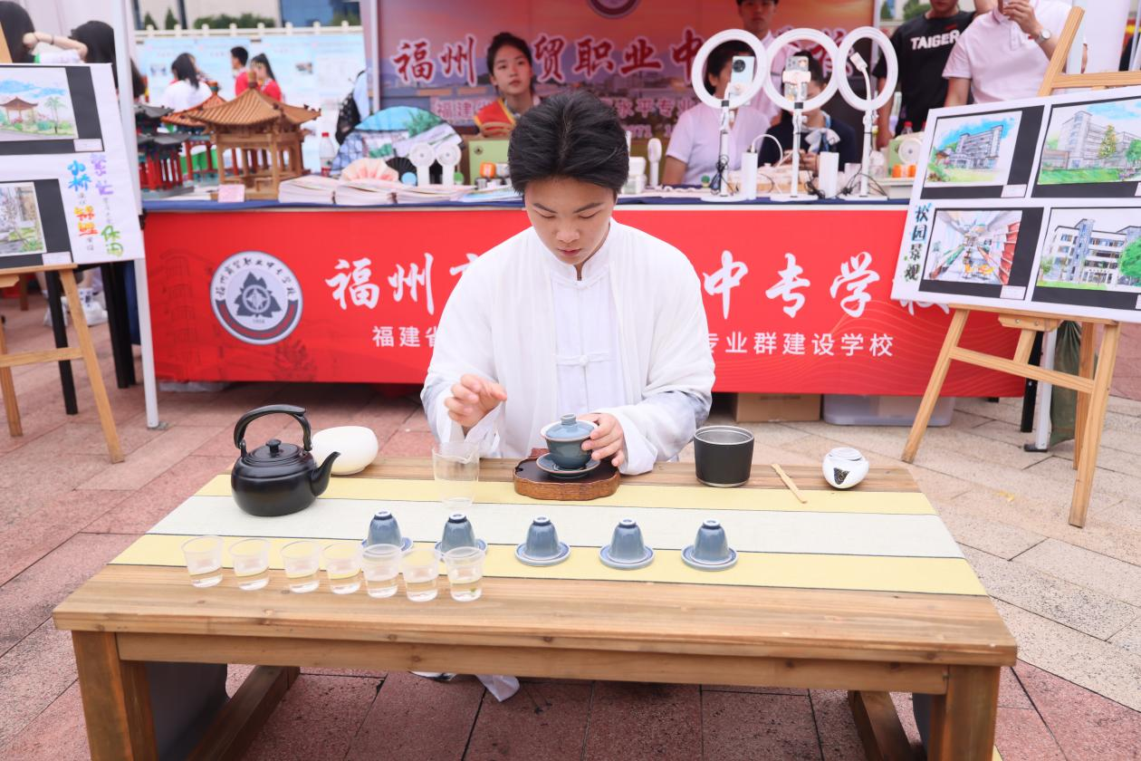 在福州商貿(mào)職專的展位上,陳列有學(xué)校室內(nèi)設(shè)計(jì)專業(yè)學(xué)生的課堂作品:榫卯拼搭中國傳統(tǒng)古建筑;有動(dòng)漫美術(shù)專業(yè)學(xué)生手繪的校園風(fēng)景制作而成的校園文創(chuàng)產(chǎn)品;有茶葉生產(chǎn)與加工專業(yè)學(xué)生的手工制茶、茶藝展示等。形式多樣的展示項(xiàng)目,充分體現(xiàn)了學(xué)校不同專業(yè)豐富多彩的教學(xué)成果。