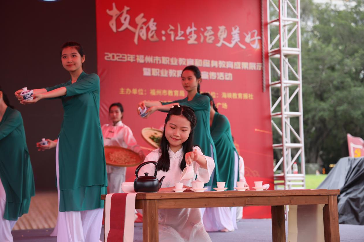 由我校學(xué)生表演的節(jié)目《當(dāng)綠葉遇上茉莉花》(音詩畫)參加了現(xiàn)場的展演活動(dòng)。節(jié)目用詩化的語言,在古香古色的音樂中,展示出學(xué)校茶葉生產(chǎn)與加工專業(yè)學(xué)生學(xué)習(xí)和制作茶葉的流程,精彩絕倫,創(chuàng)意不斷。讓觀看的市民朋友們感受到學(xué)生對(duì)專業(yè)技能的熱愛,在源于生活、高于生活的藝術(shù)畫面中,再次升華了本次職教周“技能:讓生活更美好”的主題。