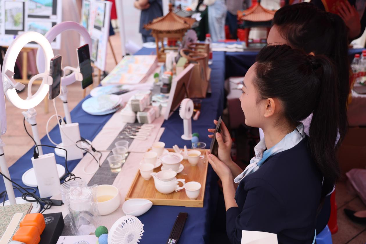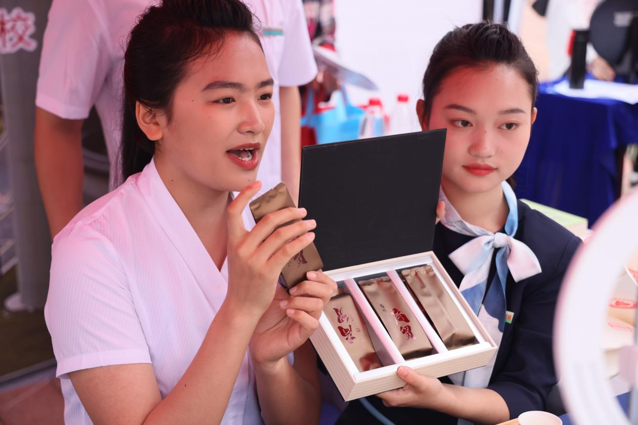 學(xué)校電子商務(wù)高水平專業(yè)群的學(xué)生,在展位上開展了一場現(xiàn)場“直播帶貨”技能展示,同時(shí)為線上線下的觀眾們介紹著學(xué)校的校園文創(chuàng)和手工茶。她們直播技巧嫻熟,激情澎湃、妙語連珠。一段段生動(dòng)的介紹,一次次幽默的互動(dòng),吸引了路過的領(lǐng)導(dǎo)、市民和外國友人紛紛駐足、咨詢,現(xiàn)場氣氛熱烈。